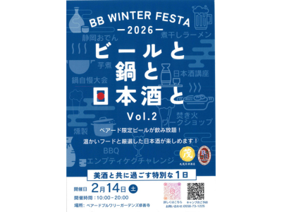 前回ご好評だった、BB Winter Festa「ビールと鍋と日本酒と」の第2弾! 冬の限定ビールを中心に、おいしい鍋と、日本酒を。 今回は、沼津にある「丸茂芹澤酒店」さんにお越しいただき、おいしい日本酒をご提供いただき、日本酒講座も開催していただく予定です! 【日時】 2026年2月14日(土)10:00~20:00 【会場】 ベアードブルワリーガーデン修善寺(伊豆市大平105... -