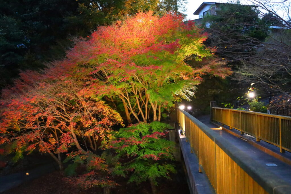 夜空の満点の星とライトアップされた樹木をお楽しみください。