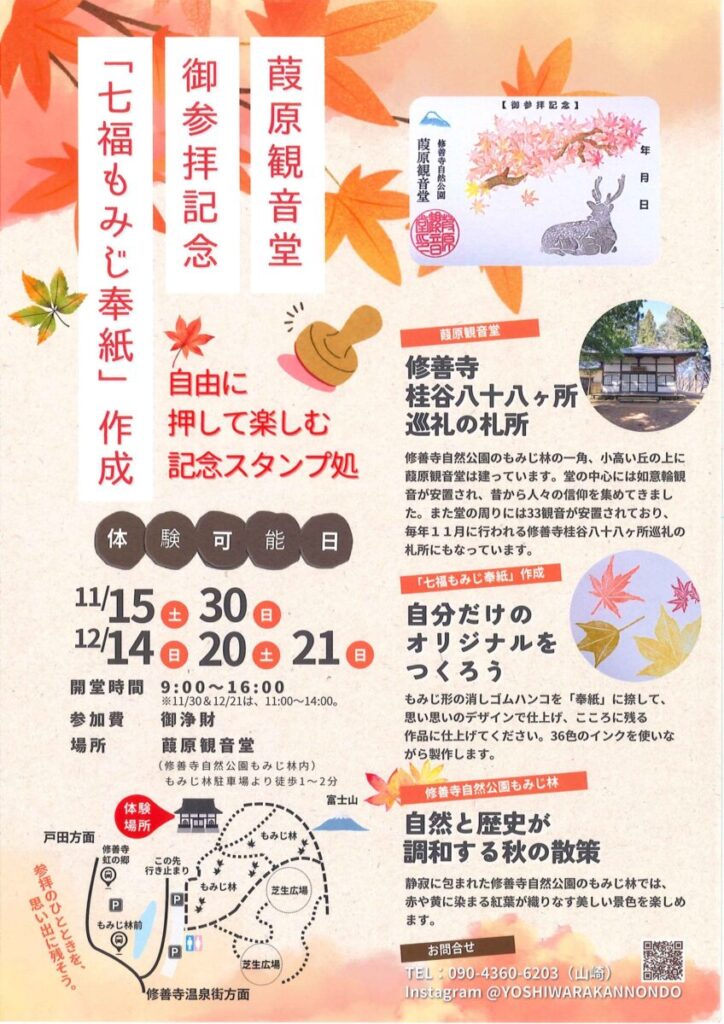 『葭原観音堂 御参拝記念「七福もみじ奉紙」作成』では、堂内にある奉紙に、「もみじの消しゴムハンコ」をペタペタ押して、自分だけの記念紙をお作りいただけます。