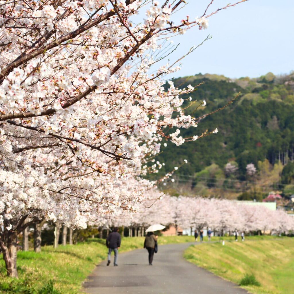 修善寺駅から徒歩5分。狩野川沿いの桜並木は牧之郷コミュニティ広場付近まで続いています。 ぜひ散策してみてください。 天気が良ければ富士山もみることができます。