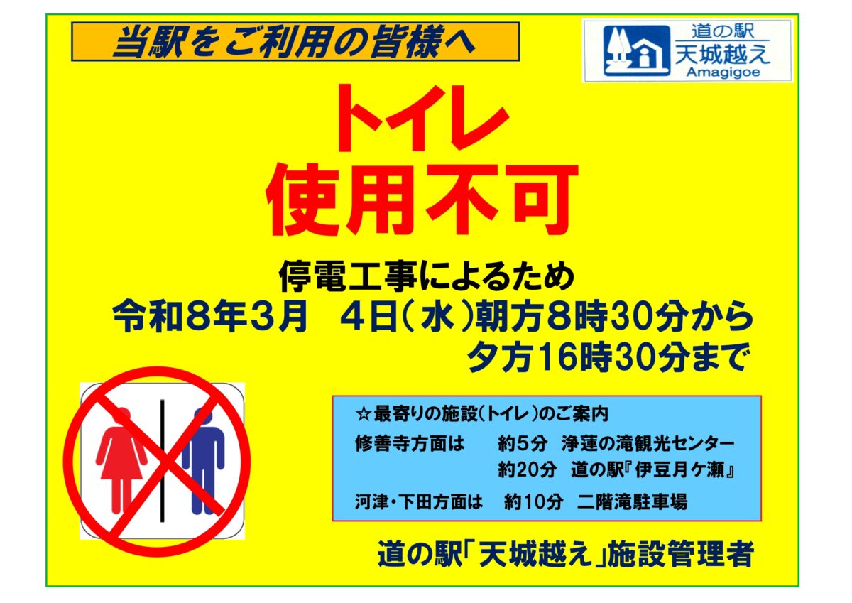 【2026.3.4(水)】道の駅天城越え トイレ使用不可&臨時休業のお知らせ