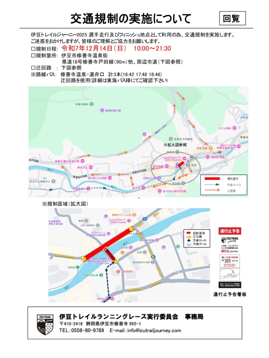 『伊豆トレイルジャーニー2025』の 選手走行及びフィニッシュ地点として利用の為、交通規制を実施します。