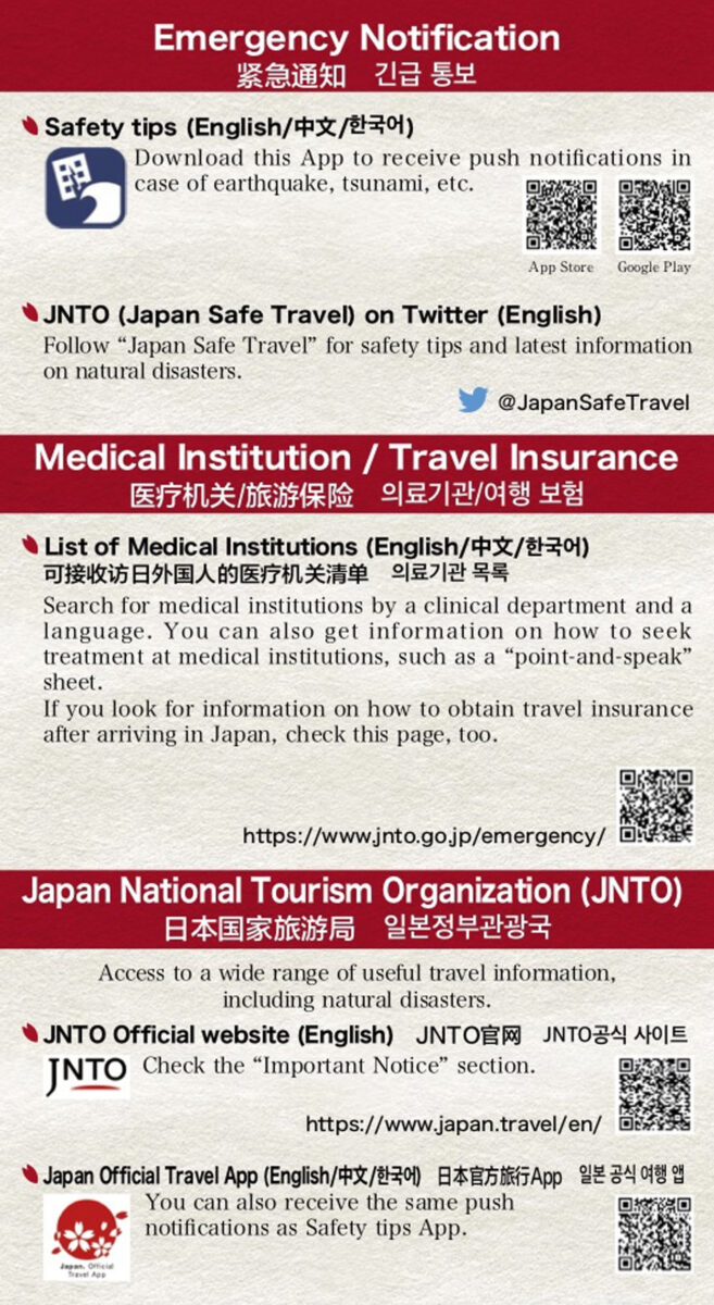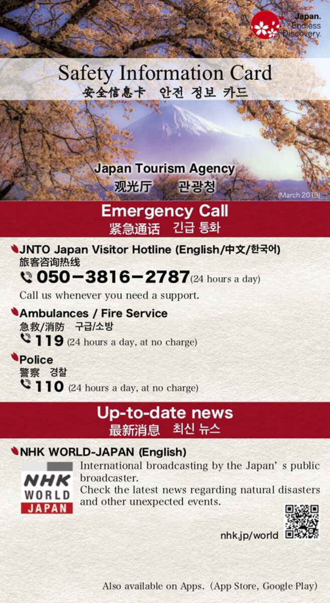 災害時に備える訪日外国人旅行者向けのセーフティインフォメーションカードです。(観光庁製作)