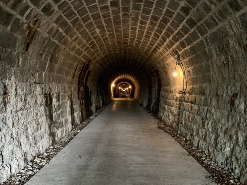 静岡県伊豆市と、河津町を結ぶ国道414号(旧道)のトンネルで、1900年(明治33年)に起工、1904年(明治37年)に竣工、1905年(明治38年)に開通しました。全長は445.5メートルで、トンネル壁面や入口アーチなどはすべて切り石で作られています。現存する石造トンネルでは国内最長です。