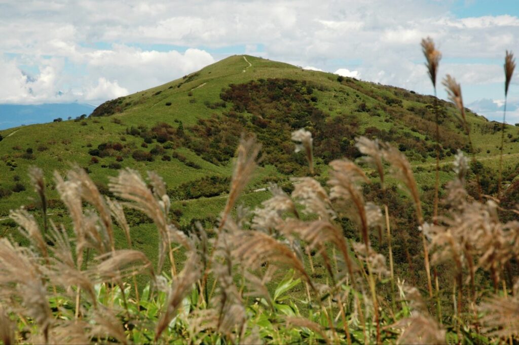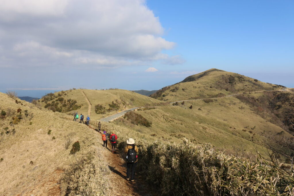 クマザサの茂る小道をたどり金冠山への道を右にわけて左へ。戸田峠に出てそのまま西伊豆スカイライン沿いの尾根を登ると、全山を熊笹がおおい、春にはアセビ・イヌツゲが群生し花も見られます。山頂からの展望は360度、吹き抜ける風が心地良いです。船原峠に下りて136号のバス停・船原峠口までのコースです。