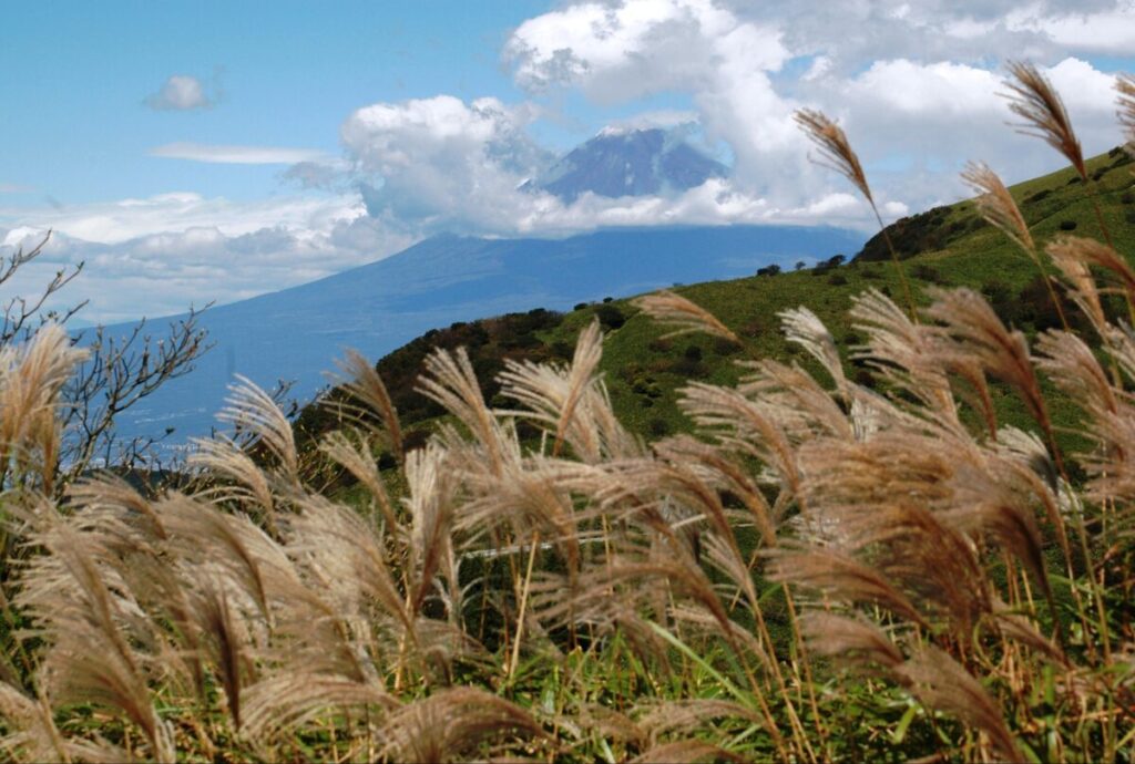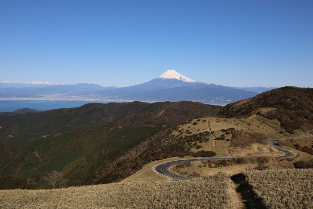 修善寺駅から戸田行きバスで約30分のだるま山高原レストハウスが起点。ここから伊豆の三景観のひとつに選ばれた駿河湾と富士の眺望を楽しめます。