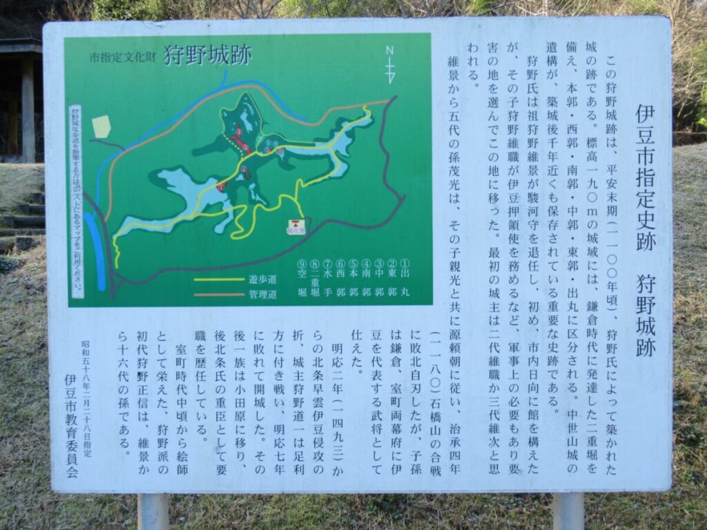 狩野城は、狩野川と柿木川合流点の南側、標高189mの丘陵上に築かれた山城です。山上には、「本曲輪」を中心に「出曲輪」、「東曲輪」、「西曲輪」、「二重堀」などの遺構が残っており、中世城郭の面影を伝える貴重な史跡として、伊豆市の指定史跡になっています。