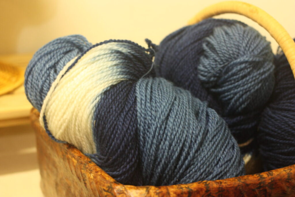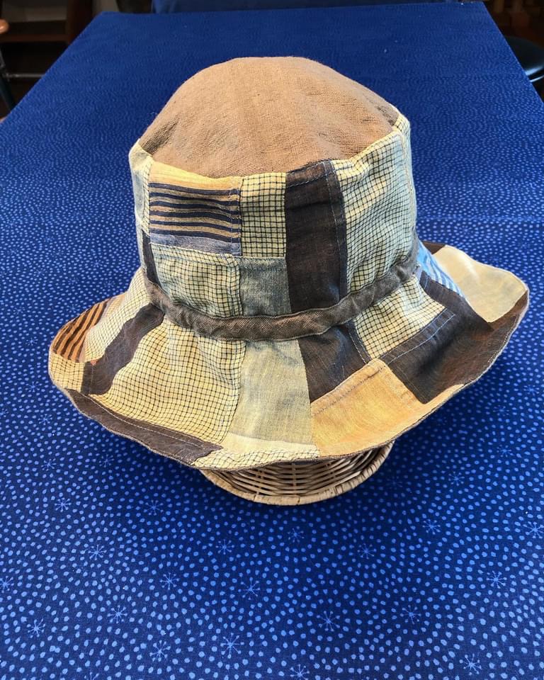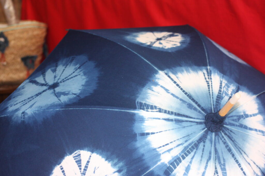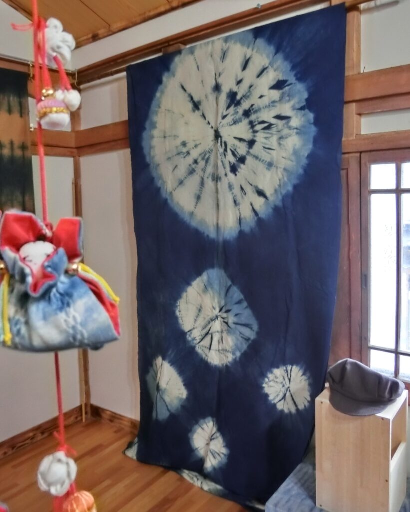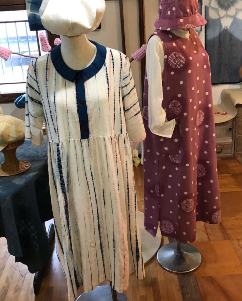藍染はもちろん、薄い緑色のワサビ染め、ピンク色の紅花染め、黄金色のたまねぎの皮染めなど、草木由来の染物作品がたくさん。