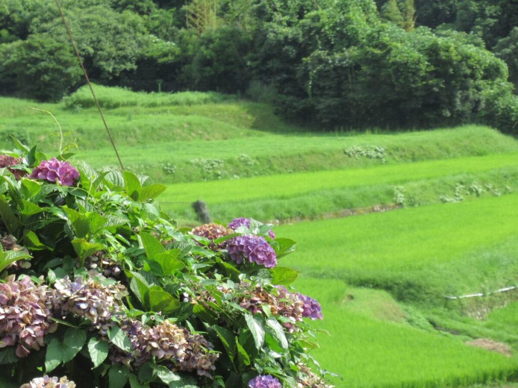 天城湯ヶ島地区長野に広がる古きよき日本の田園風景。扇状地のように上から下へ徐々に田んぼや畑が広がっています。