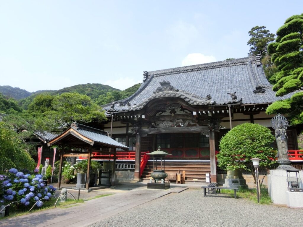 本堂内に掲げられている、明治時代に奉納された90枚の板絵は、伊豆市指定有形文化財となっています。日蓮上人の一代記を描いた畳一畳大ほどの極彩色の板額絵で、順番に拝見することで、日蓮大聖人の一生を知ることができます。住職や寺務がいらっしゃるときは、板絵について説明をしていただけます