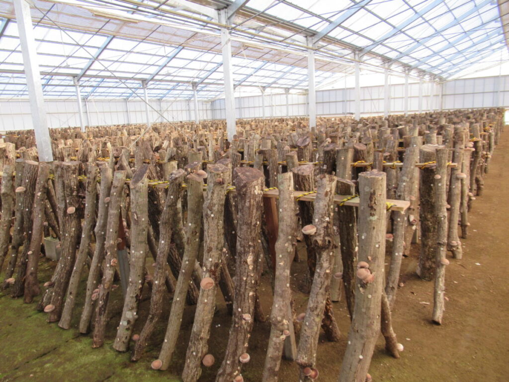 しいたけの里では約2万3千㎡の敷地に、椎茸のぼた木が約1万本ずらりと並び、直径5cm以上はある本場ならではのふっくらした肉厚しいたけがたくさん!雨の日でも手ぶらでしいたけ狩りができます。