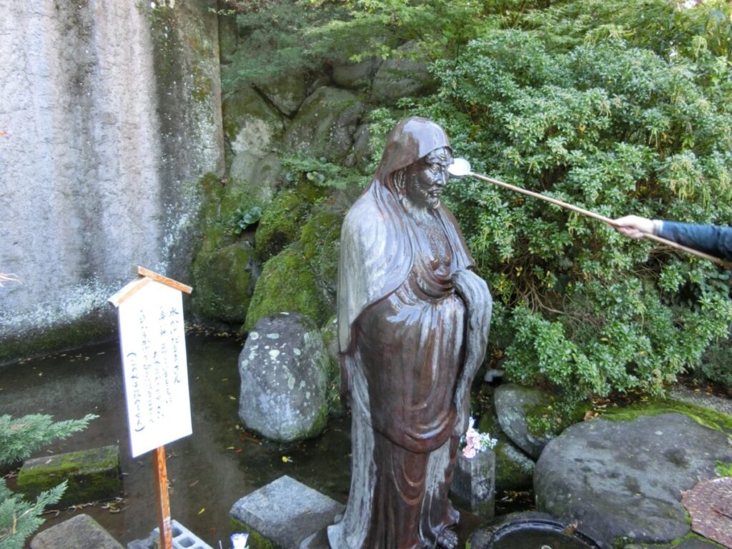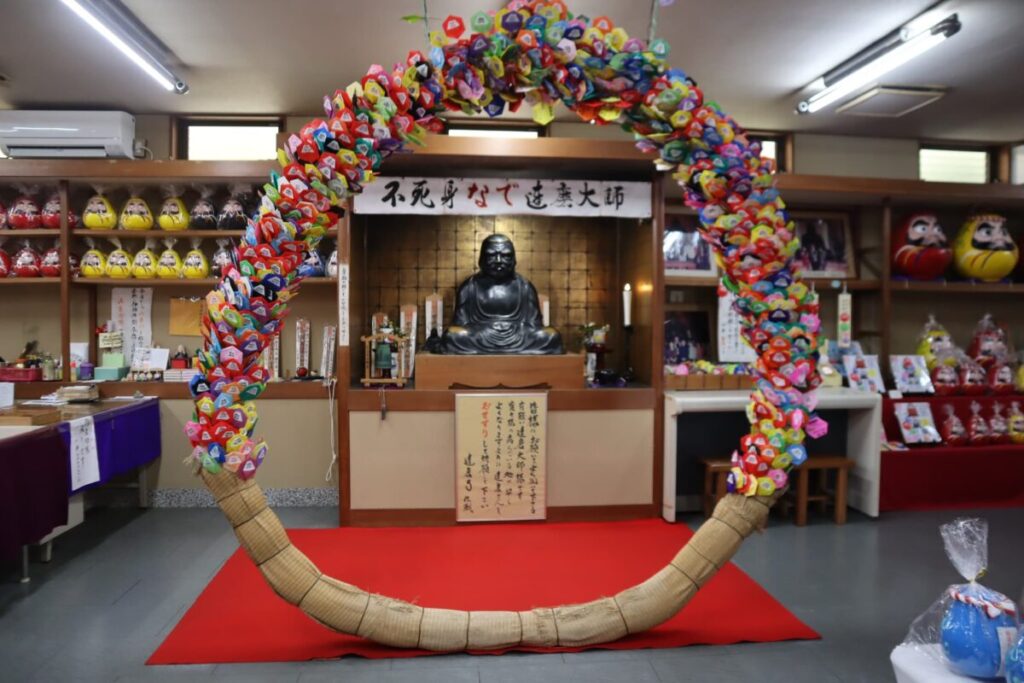 本堂には不死身達磨大師と命名された高さ5m、重さ3トンの日本最大の達磨大使坐像が安置されており、この像に「南無達磨娑婆詞」と3回唱えてお参りし、開運札に願い事をひとつ書いて宇宙創世発展の5大要素(地・水・火・風・空・識)を5色に表した五色願懸け達磨に貼り付けると願いが叶うといわれています。